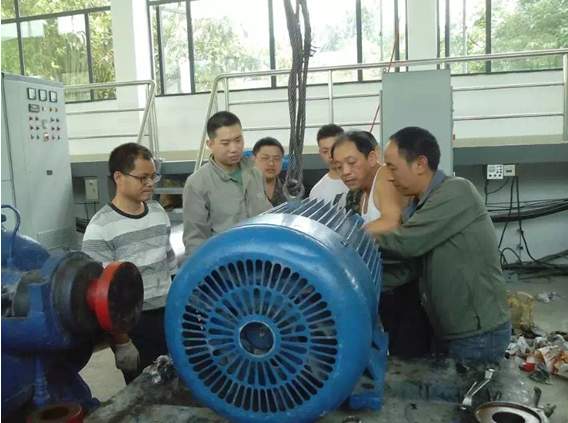 (圖為技術(shù)人員正在維護(hù)保養(yǎng)中壓泵房3#供水機(jī)組)