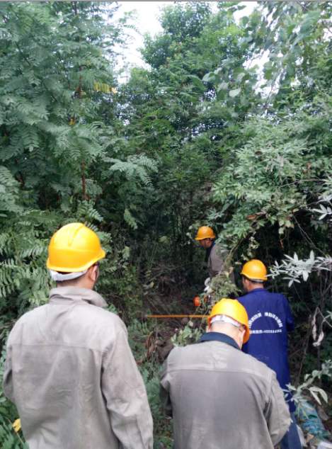 加壓站負(fù)責(zé)維護(hù)供電線路總長為16公里,且大多穿越山林,夏季樹木長勢格外迅猛,掃林任務(wù)顯得更加繁重。在密閉的樹林里異常悶熱,到處都是蚊蟲樹刺,巡線人員早上7點(diǎn)之前就早早出發(fā),戴著安全帽穿著厚厚的工作服,,頂著火辣辣的太陽,流血流汗,消滅影響供電安全的每一處樹障。(圖為工作人員正在砍伐樹障)