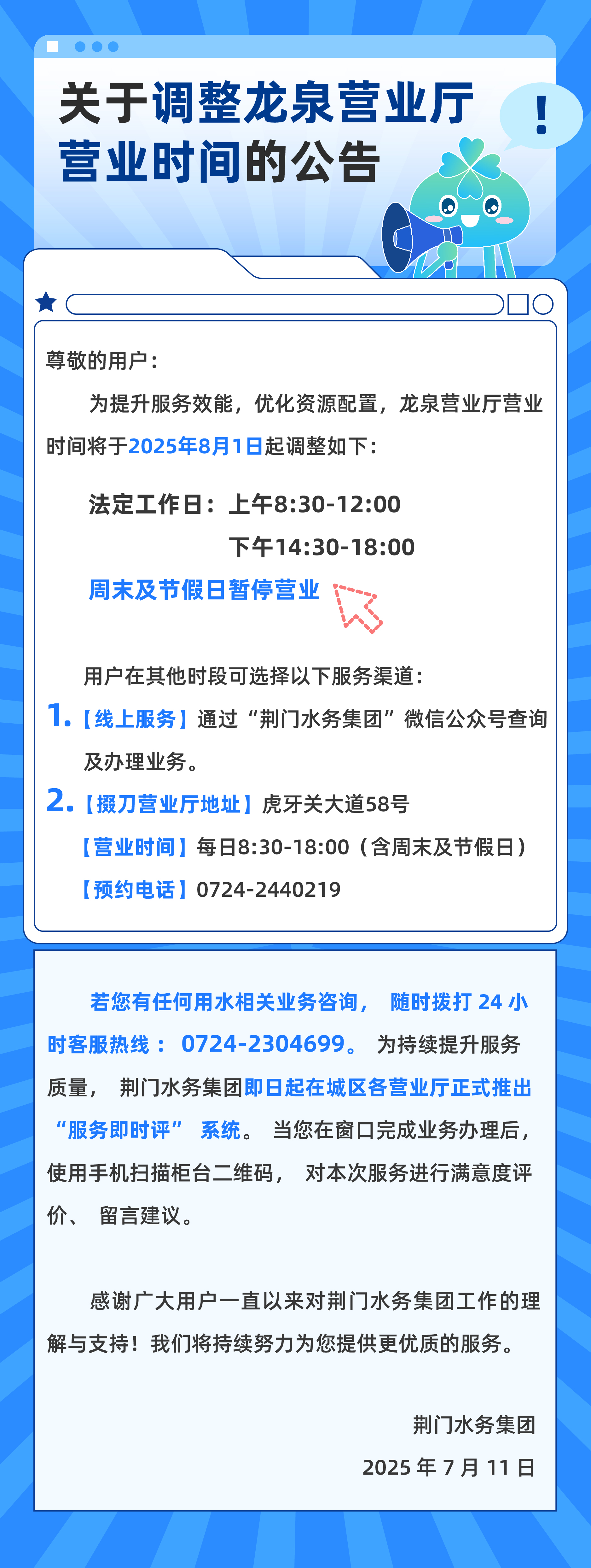 關于調(diào)整龍泉營業(yè)廳營業(yè)時間的公告